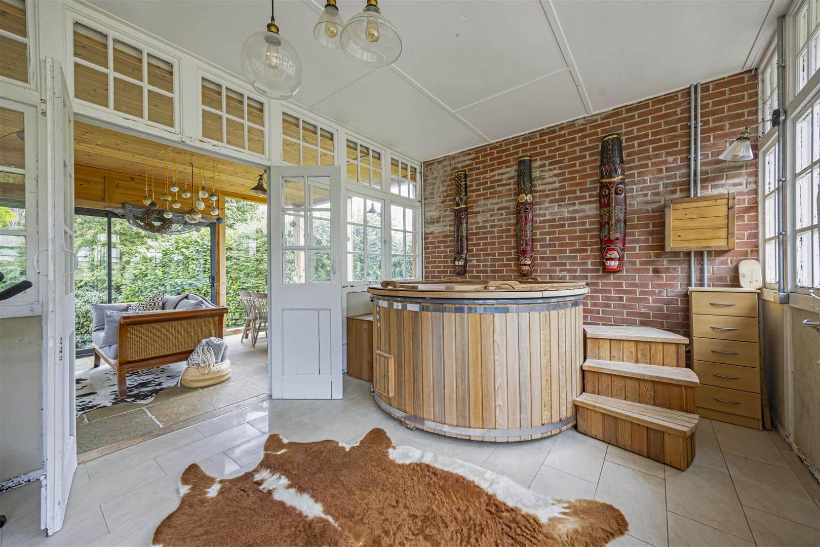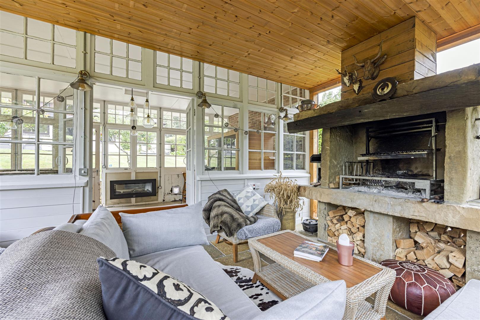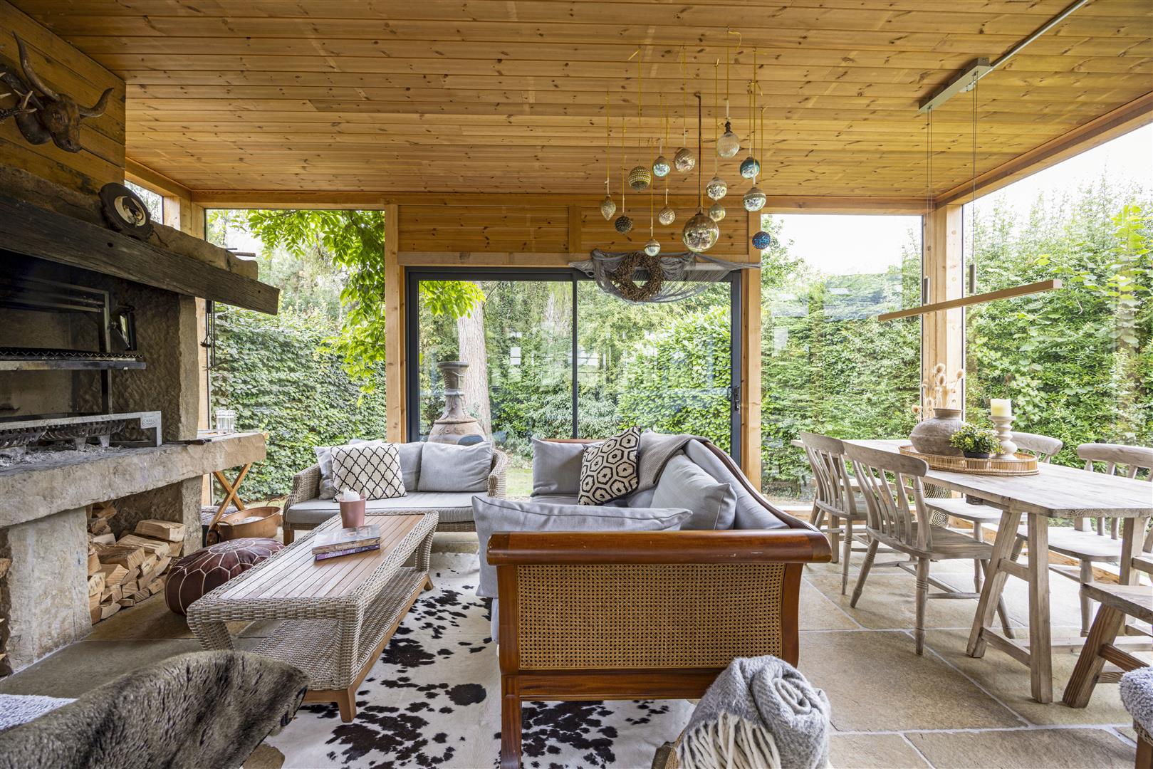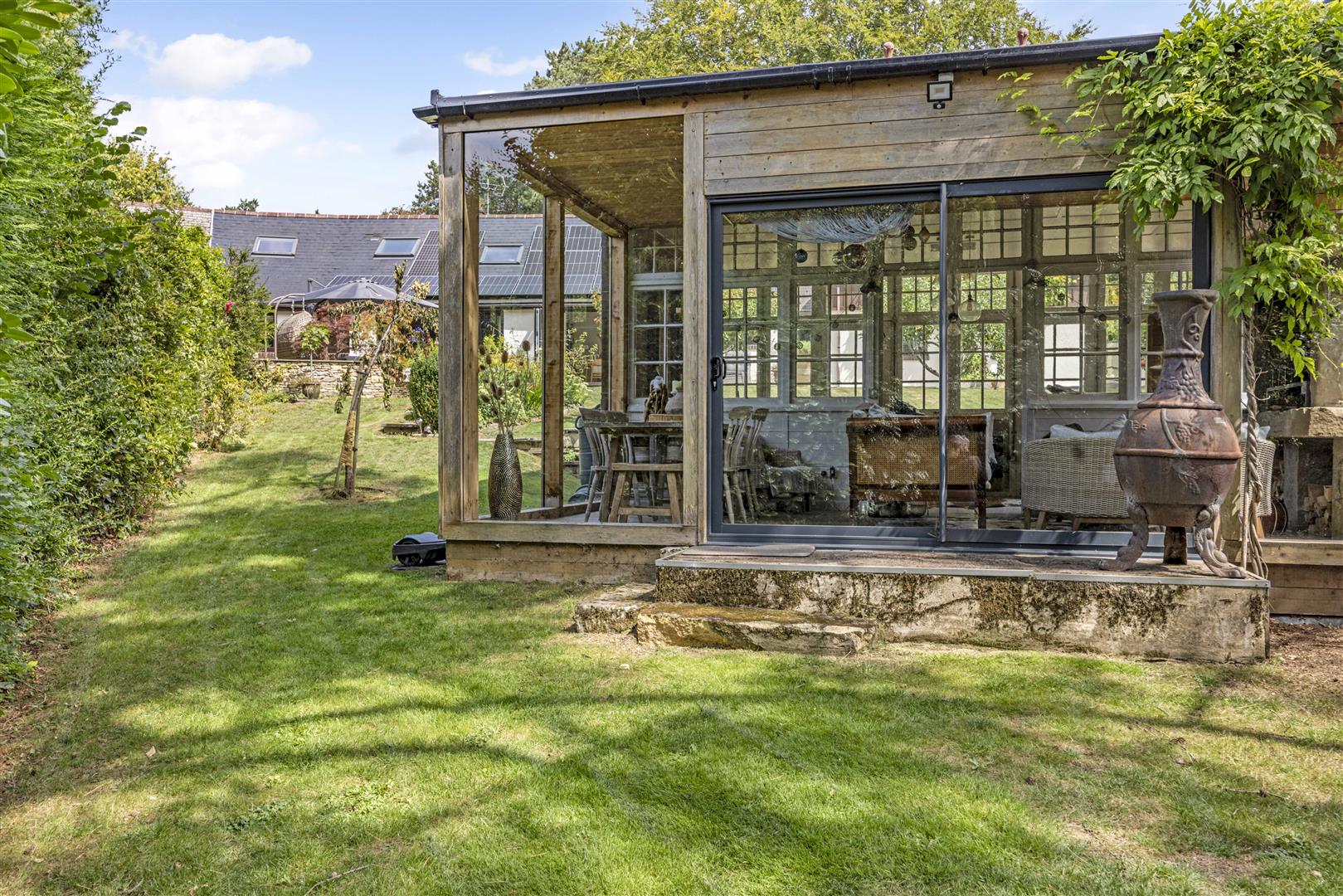 A striking open fireplace, crafted from 18th-century Tewkesbury stone, sits proudly, ideal for flame-cooked feasts or warming winter evenings. The space also boasts a bar area, a jacuzzi spa and a sauna, delivering a level of luxury and more. The partial flagstone flooring, carefully grounds the space in timeless elegance, while the high ceiling and dual-aspect glazing flood the room with natural light from both the original doors opening onto the lawn and the sliding doors to the rear, extending the living space into the garden during warmer months.