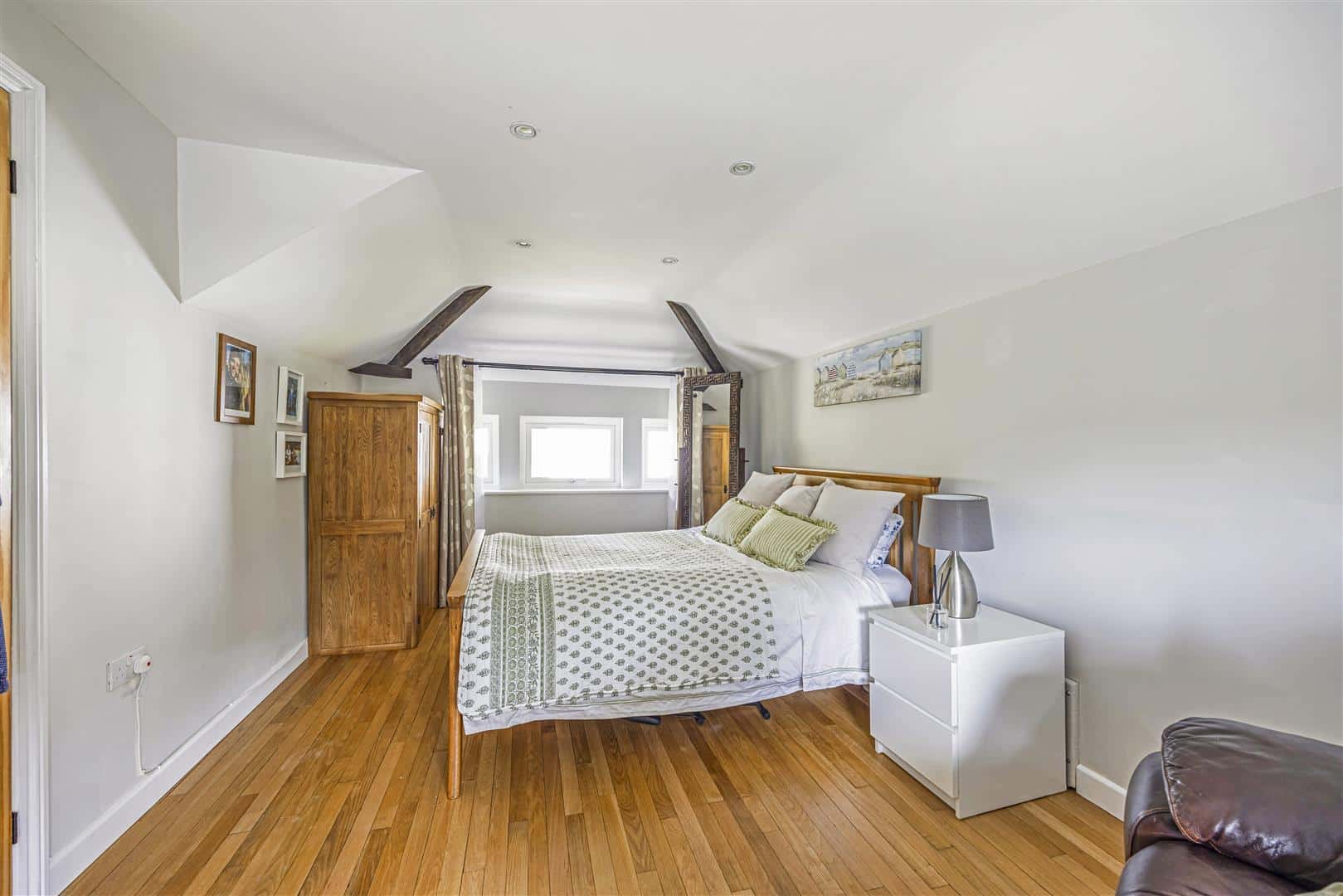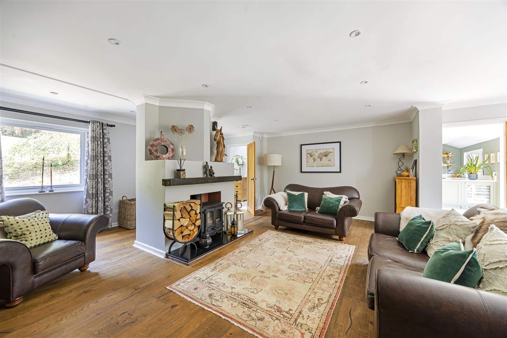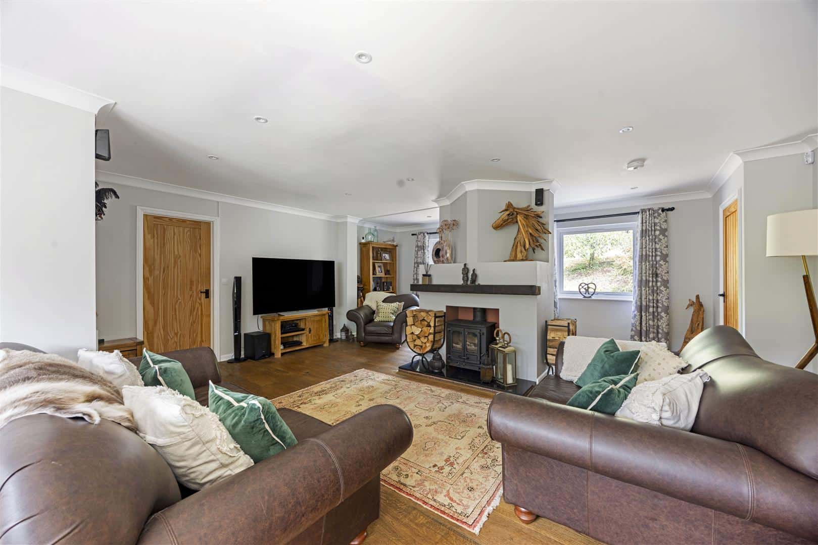 Leading seamlessly from the kitchen, the spacious sitting room is a warm and inviting space, thoughtfully designed for comfort and relaxation. At it’s heart is a striking wood burner, centrally positioned to create a natural focal point and cosy ambiance throughout the seasons. Wooden flooring enriches the room with rustic charm, while its generous proportions and natural flow make it ideal for both quiet evenings and entertaining guests.