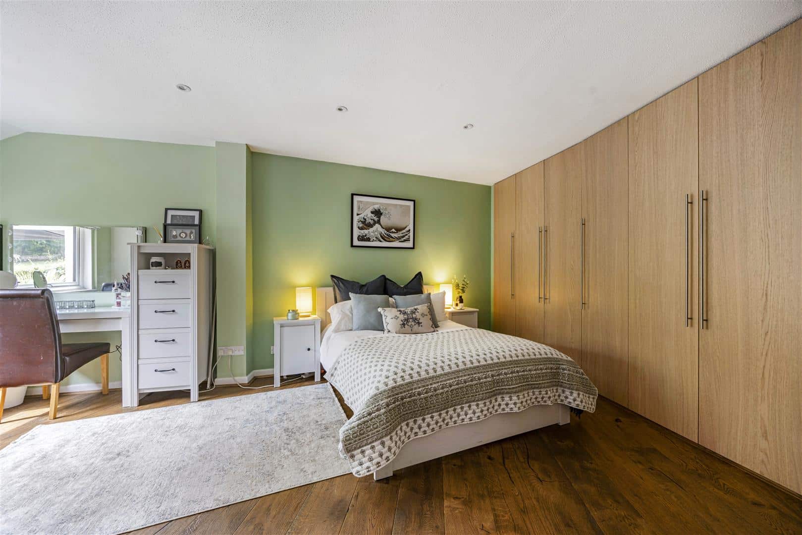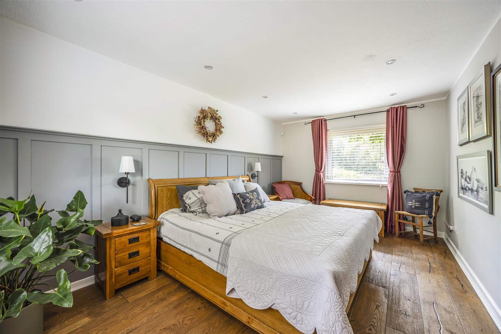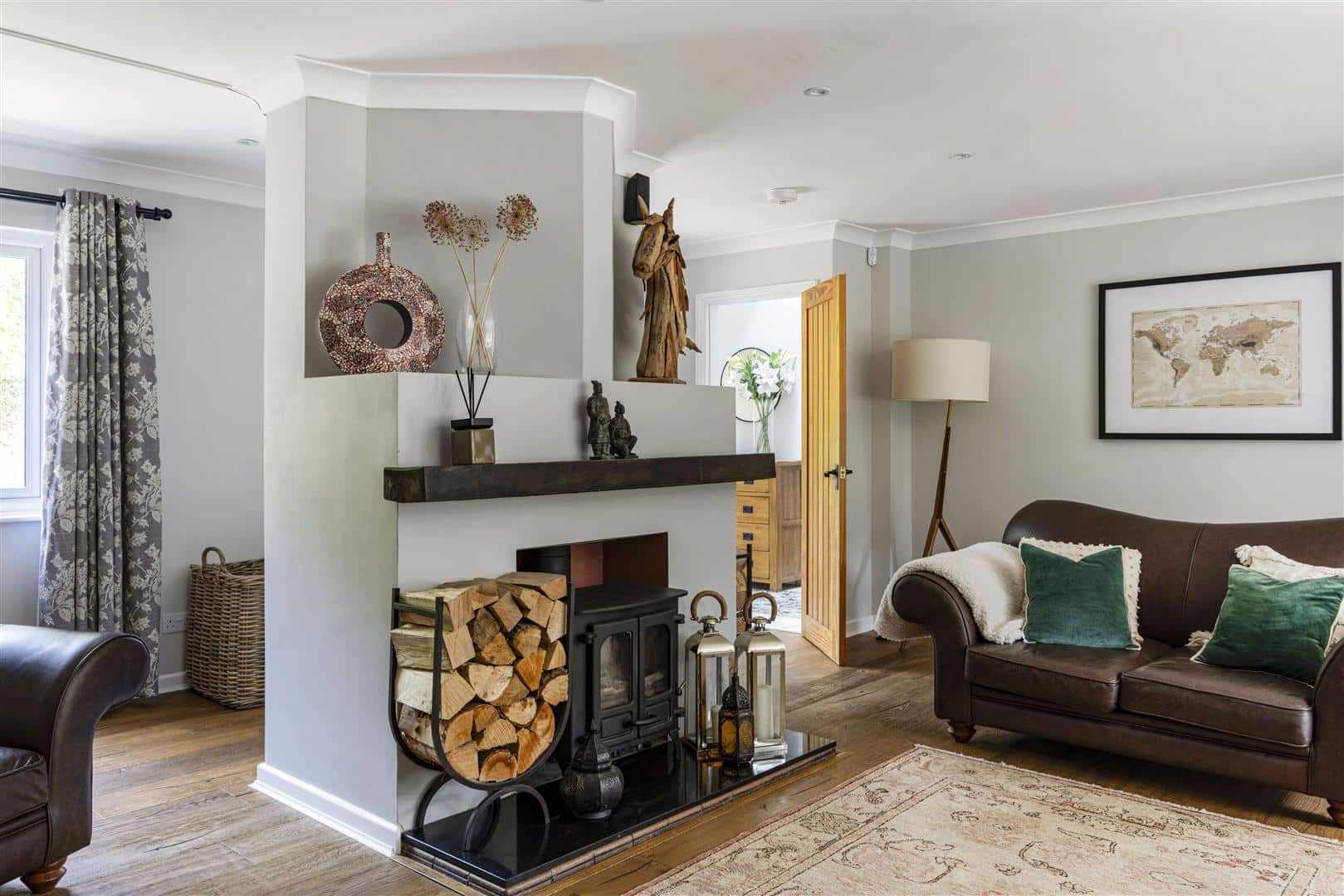 Leading seamlessly from the kitchen, the spacious sitting room is a warm and inviting space, thoughtfully designed for comfort and relaxation. At it’s heart is a striking wood burner, centrally positioned to create a natural focal point and cosy ambiance throughout the seasons. Wooden flooring enriches the room with rustic charm, while its generous proportions and natural flow make it ideal for both quiet evenings and entertaining guests.