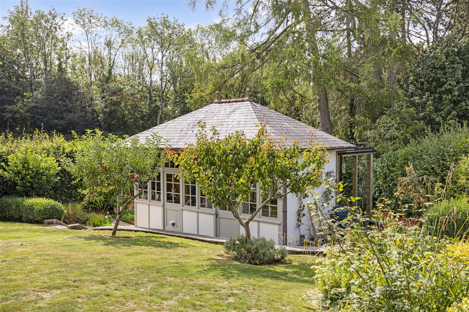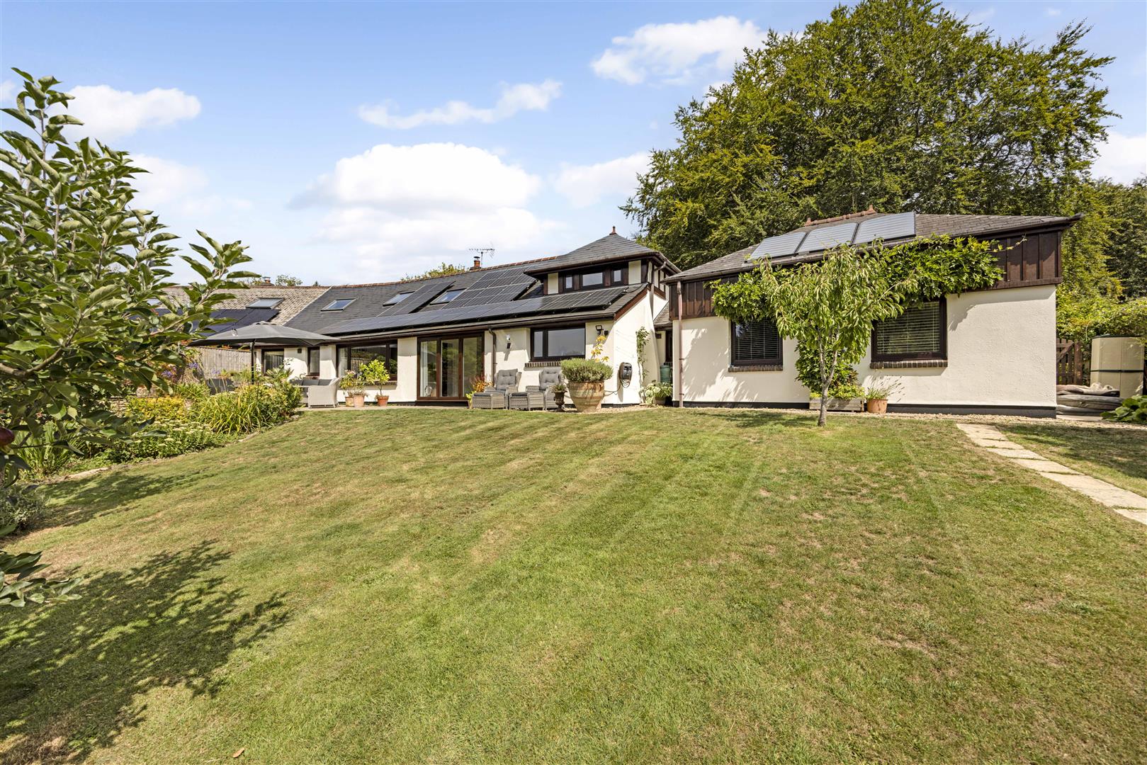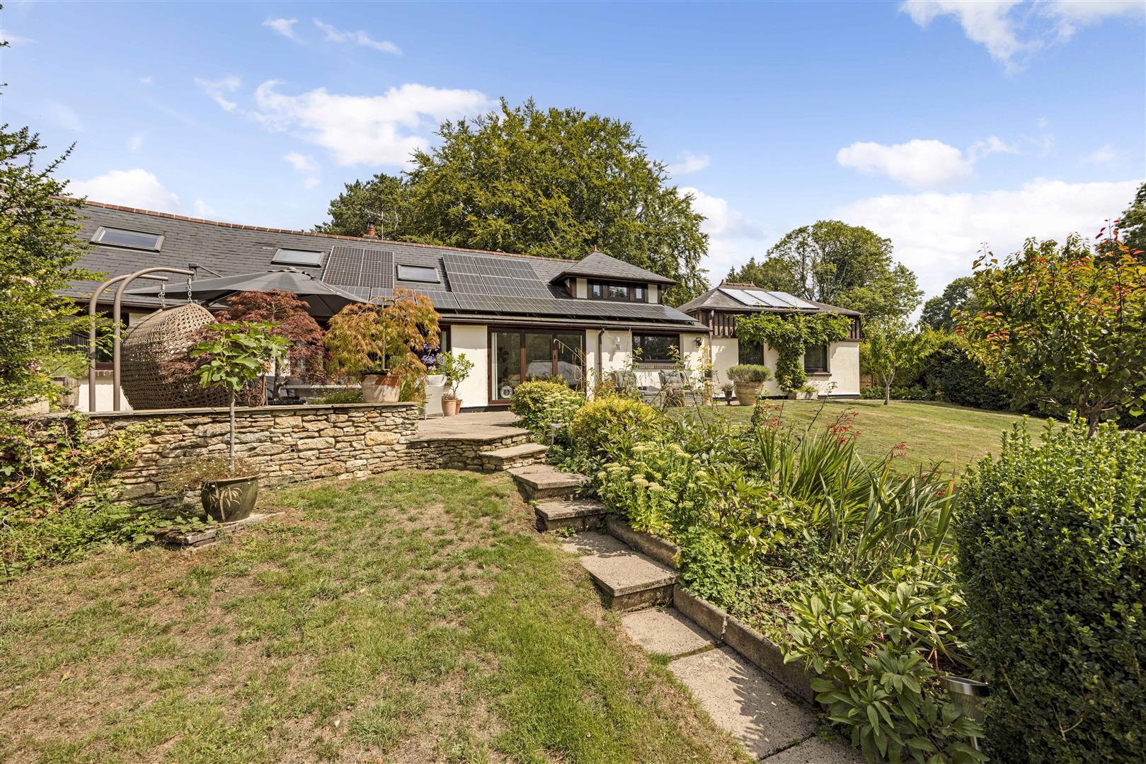 Outside, the gardens have been thoughtfully landscaped to create a setting that’s as functional as it is beautiful, offering the perfect backdrop for both al fresco entertaining and peaceful winter days. An abundance of mature planting, vibrant shrubs and fruit trees ensures colour, structure and interest all year round, delivering a garden that truly flourishes across the seasons.
