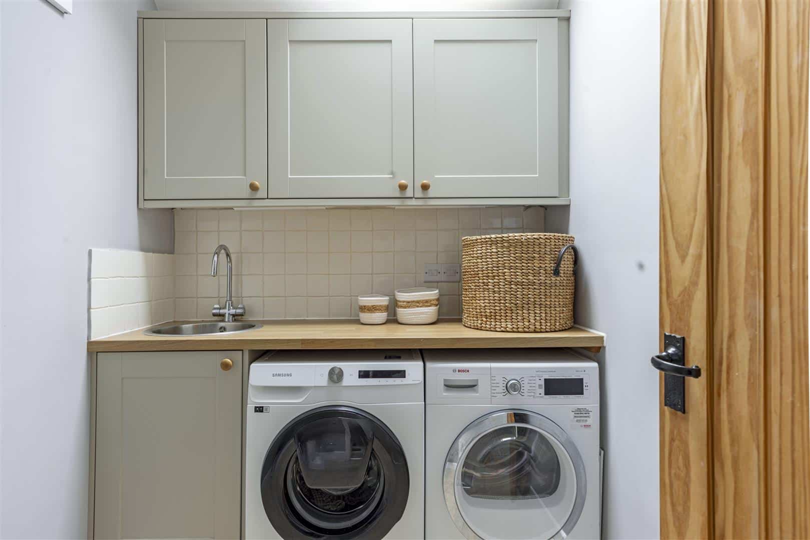 Leading off the hallway is a well-appointed utility room, with space and plumbing for washing and drying appliances, offering a discreet and functional area for day-to-day household needs.