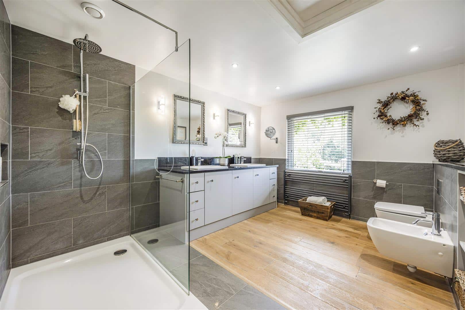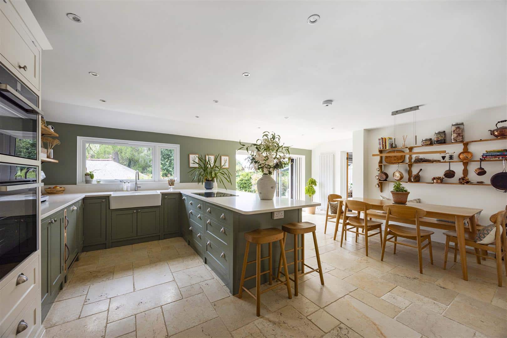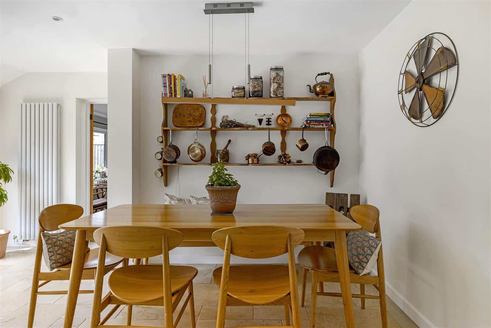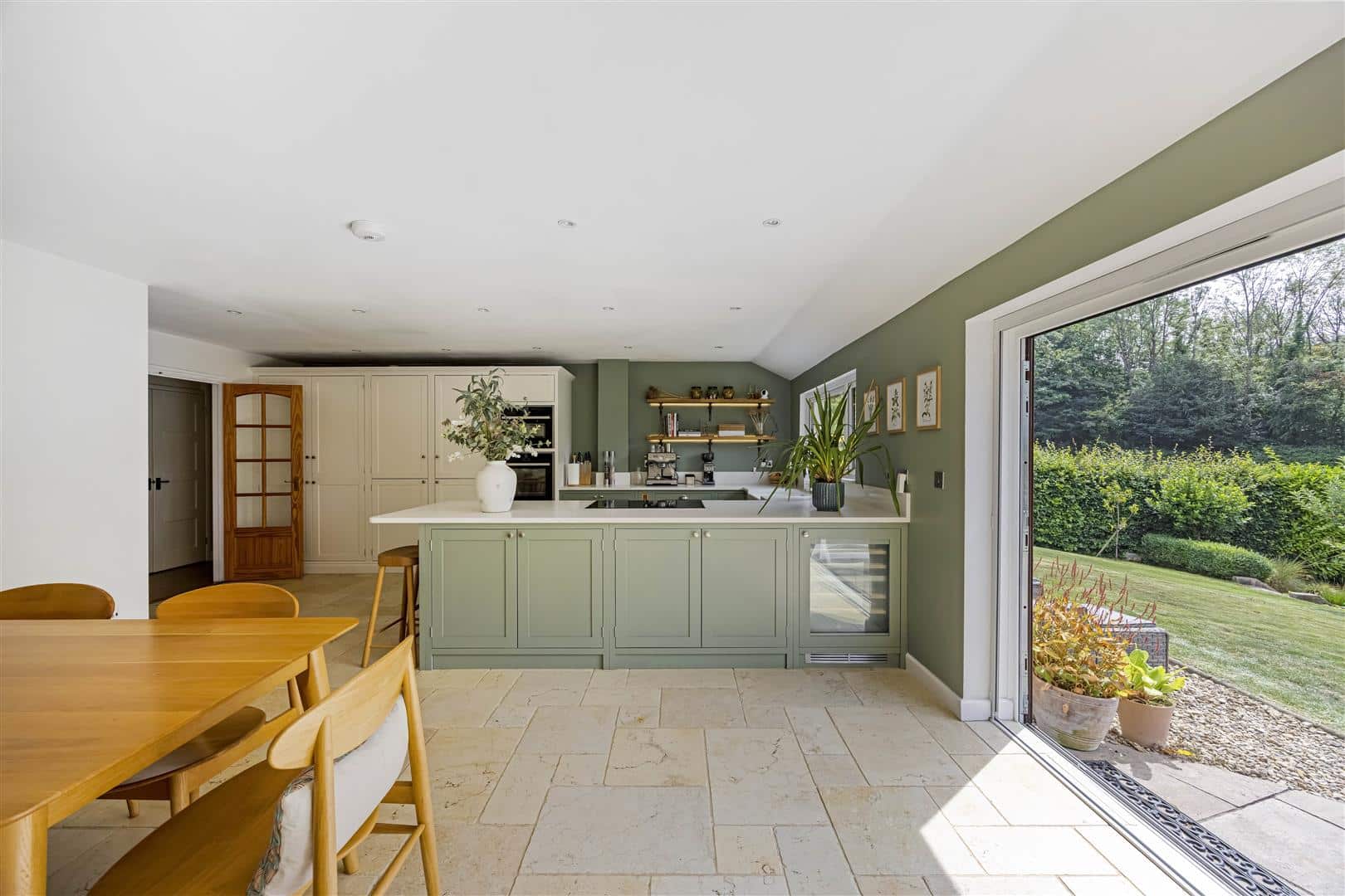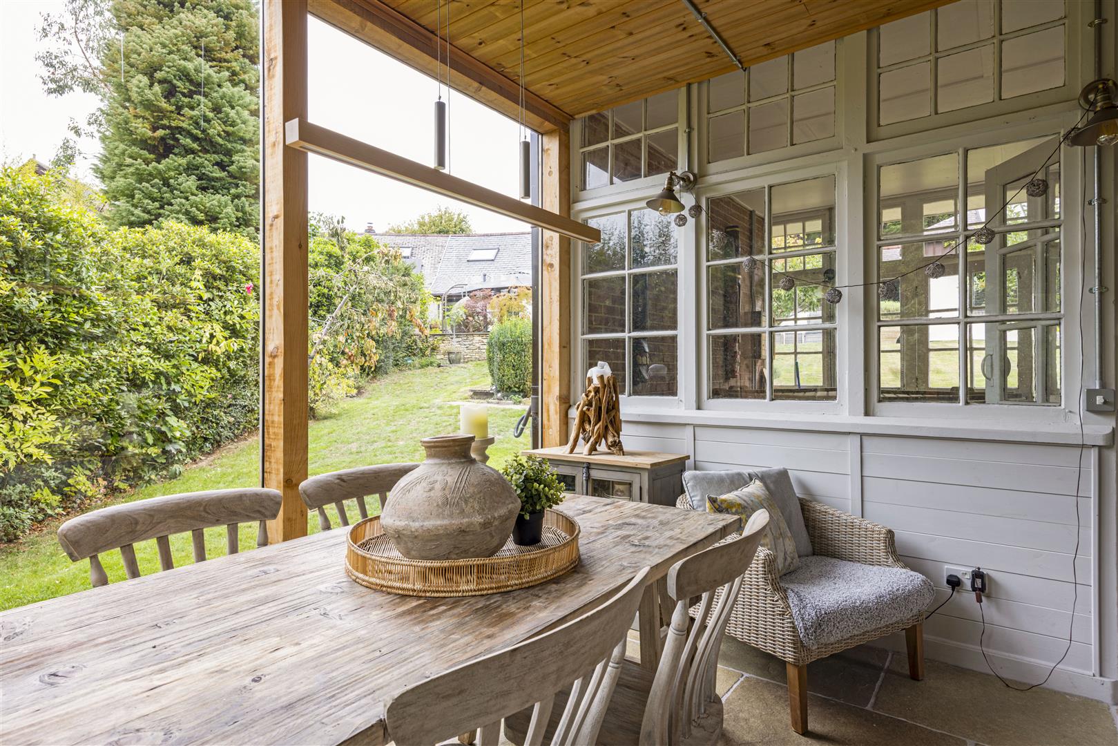 Stylish upright radiators and flagstone flooring complete the space, while sliding door doors open onto the south facing garden terrace, extending the living space outdoors and offering the perfect backdrop for relaxed entertaining.