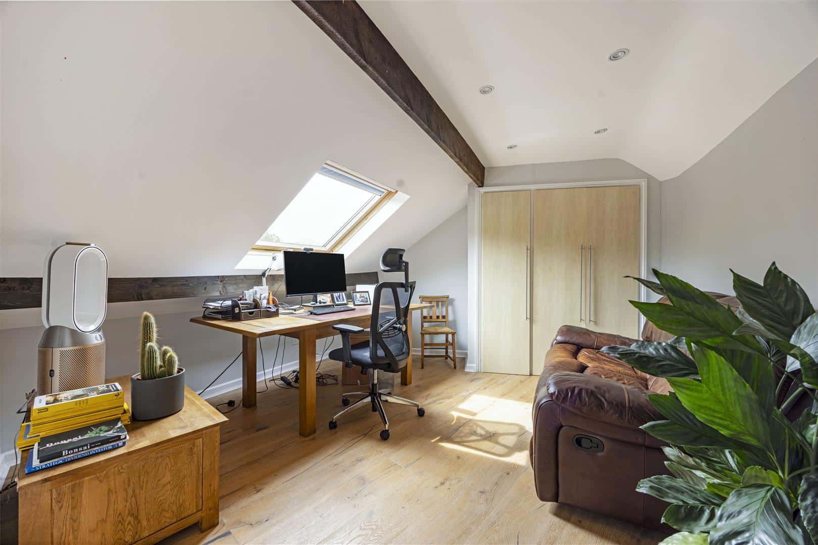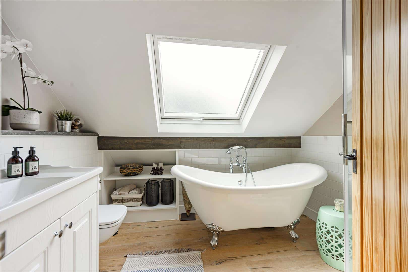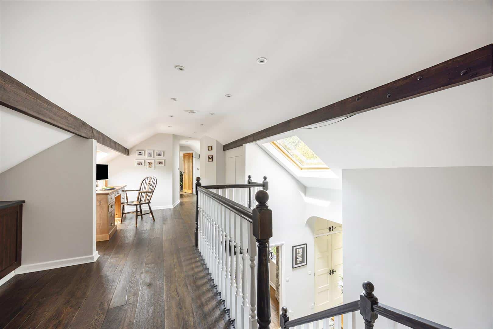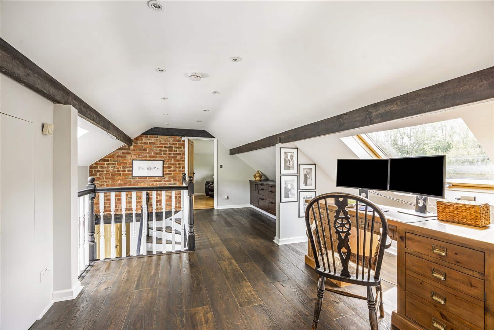 Centrally positioned within the hallway, a staircase rises to a bright and expansive landing, flooded with natural light and exposed brickwork with timber beams. This open space offers a sense of calm and versatility, with built-in storage and ample room for a home office or a dedicated workout area, depending on your lifestyle needs. The upper floor accommodates two additional double bedrooms. A stylish family bathroom featuring a clawfoot freestanding bath and a separate shower, completes the first floor creating an ideal space for family or guests.