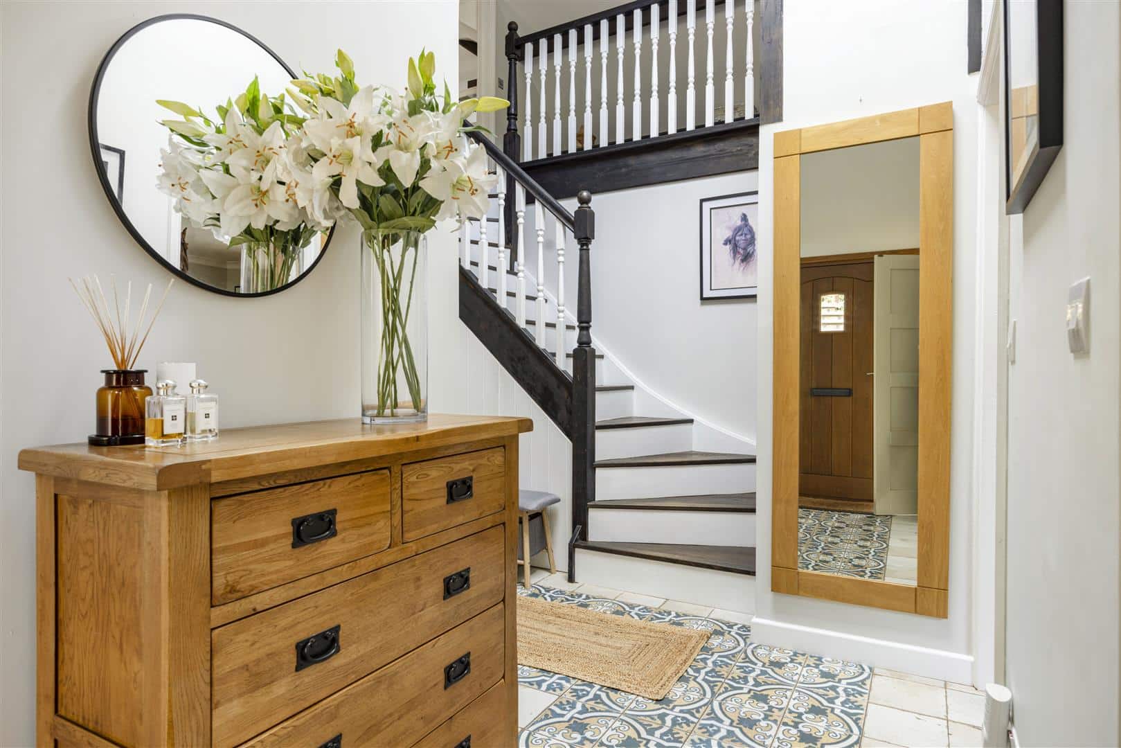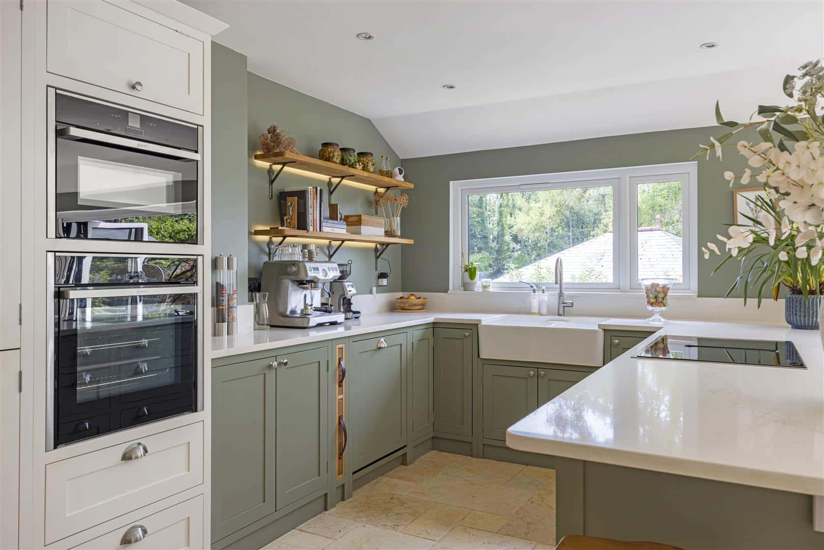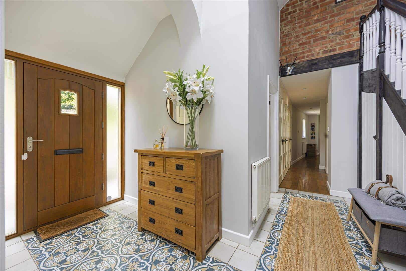 Steps lead from the private driveway to the entrance, opening into a welcoming hallway adorned with ceramic tiling and a generous double cloaks cupboard. Additionally, there is a series of bespoke fitted cupboards, providing abundant storage for coats, shoes and everyday essentials, beautifully blending practicality with considered design.