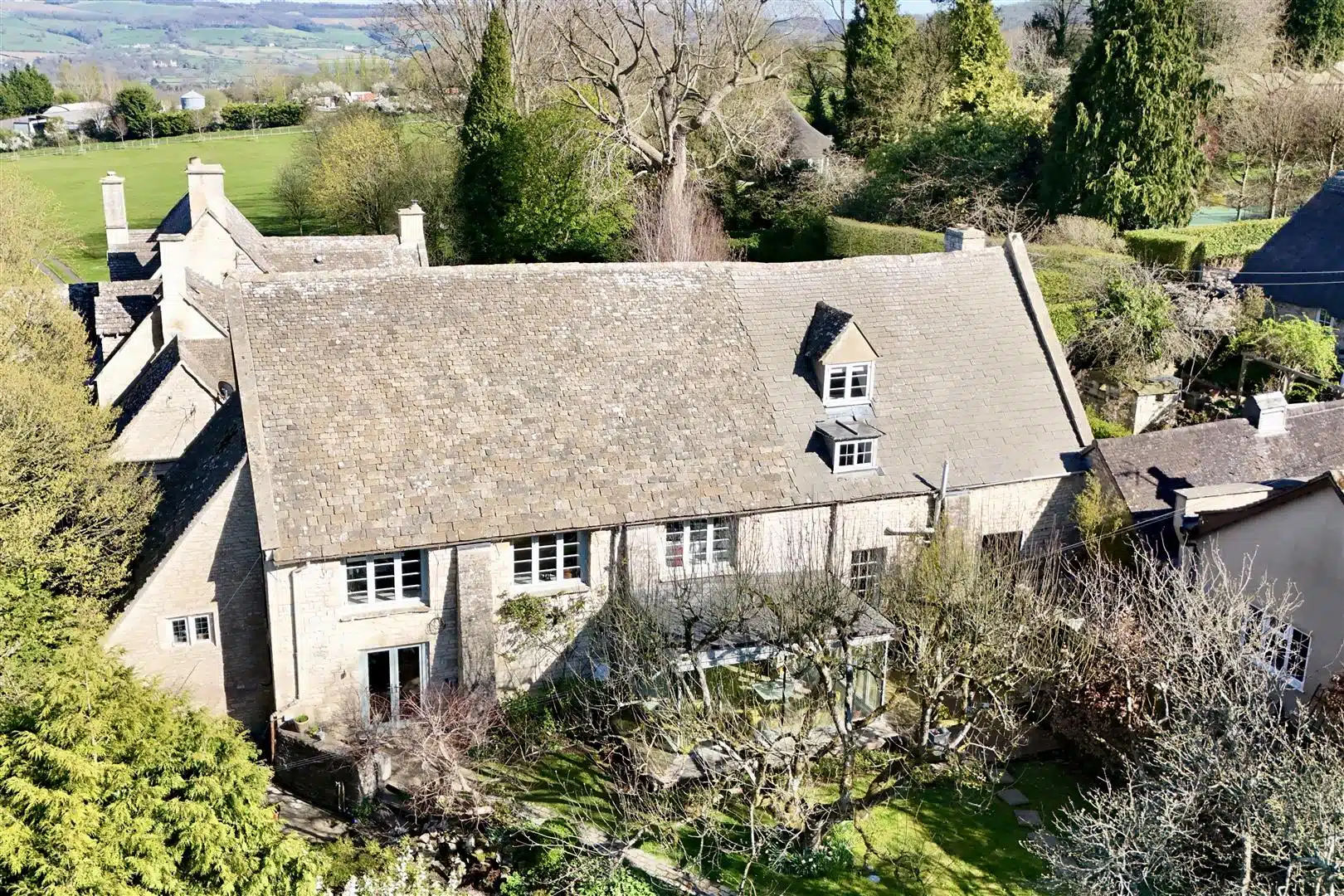 Tithe Barn House is approached via a communal drive that creates a true sense of arrival, leading off the public road into the charming hamlet of homes known as Cockbury Court. Nestled on the Cotswold escarpment within an Area of Outstanding Natural Beauty (AONB), Cockbury Court sits alongside Cleeve Hill, the highest point in England before the hills of Wales.