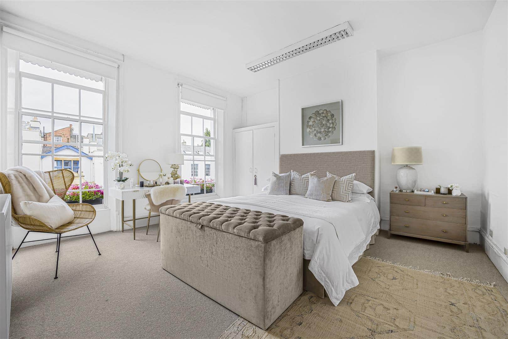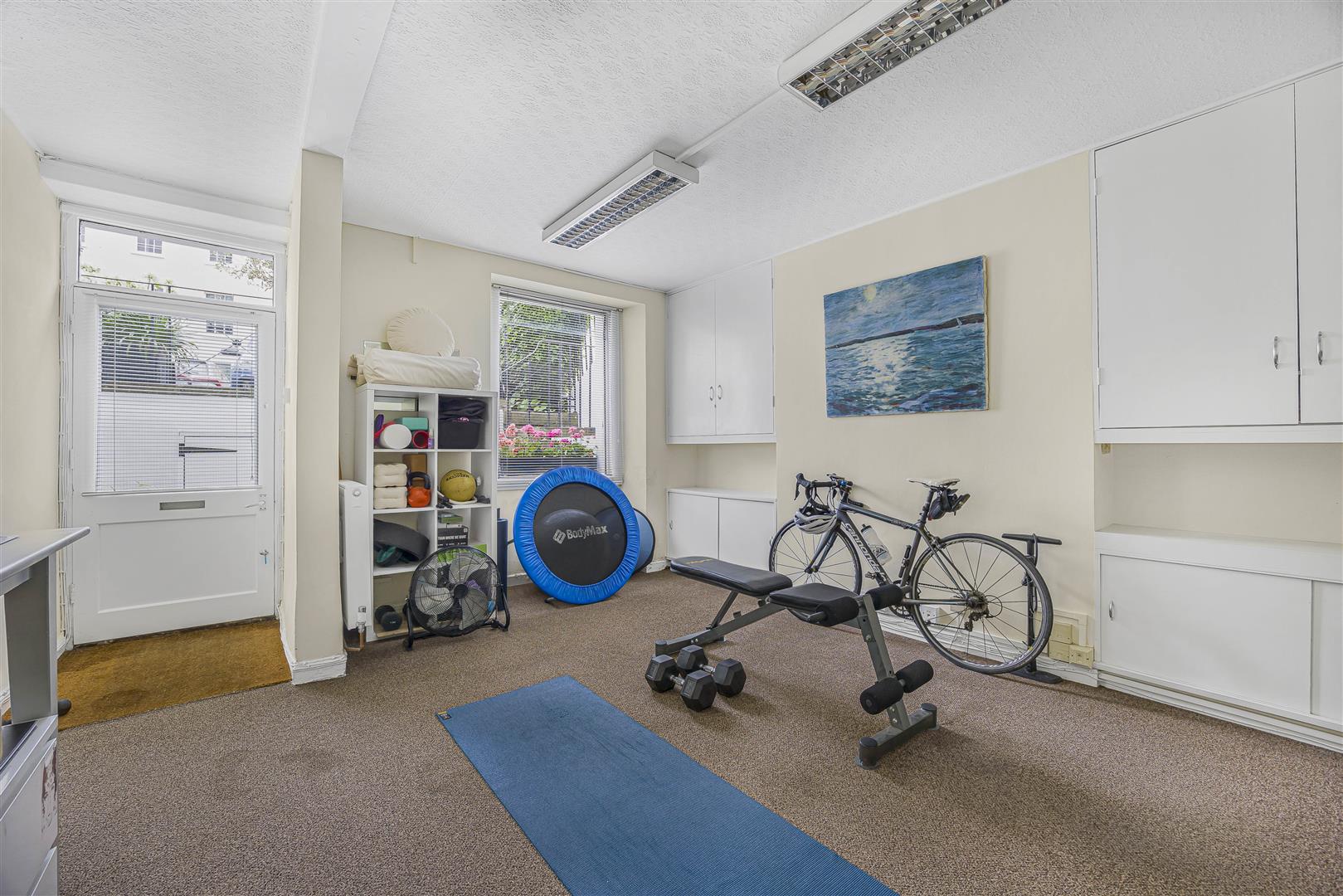 The upper floors provide four bedrooms, one arranged as a dressing room, while the lower level includes a kitchen, utility, gym and additional reception spaces with direct access to the courtyard garden. With its separate front entrance, this level naturally lends itself to a guest suite, a family recreation area, or a private apartment.